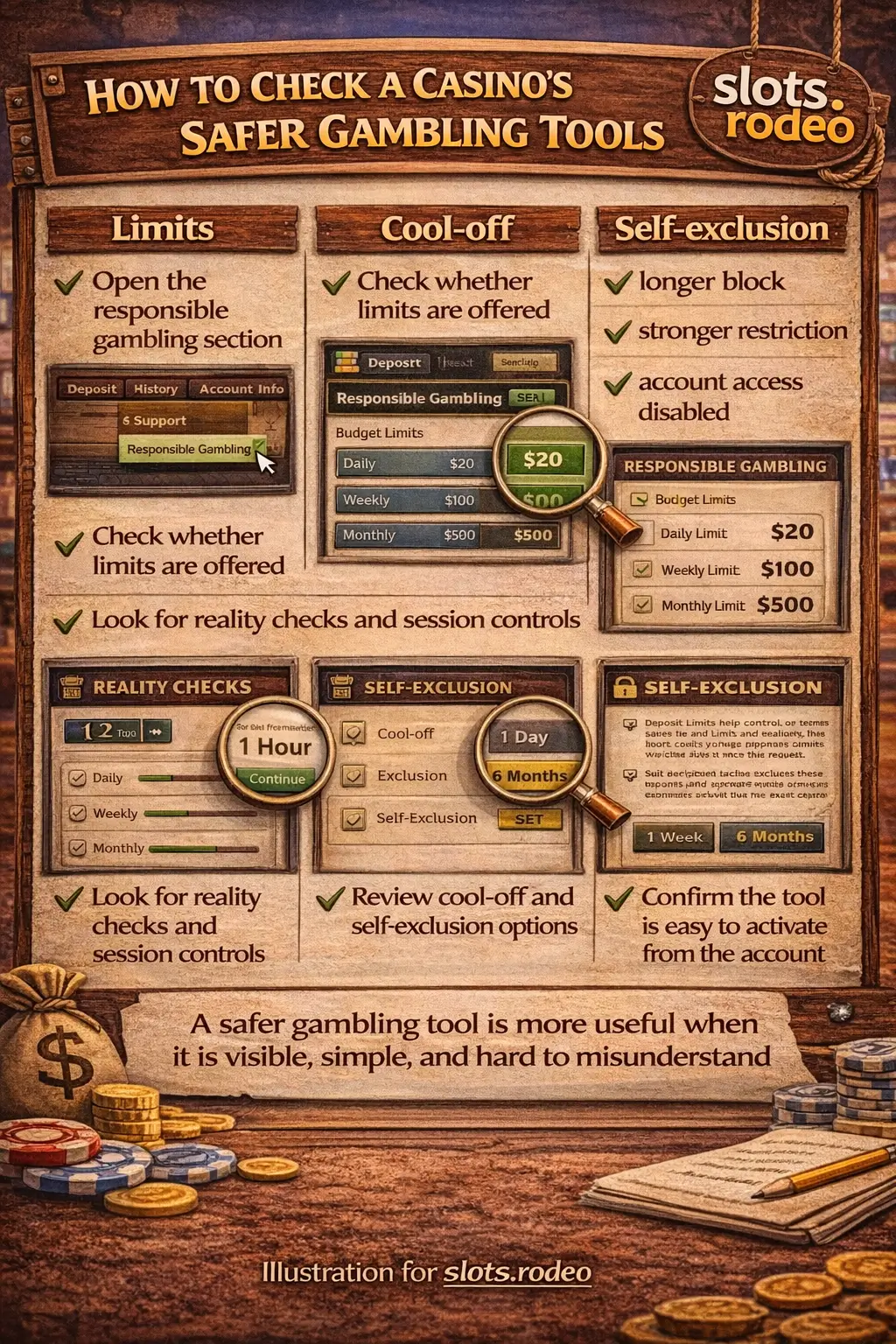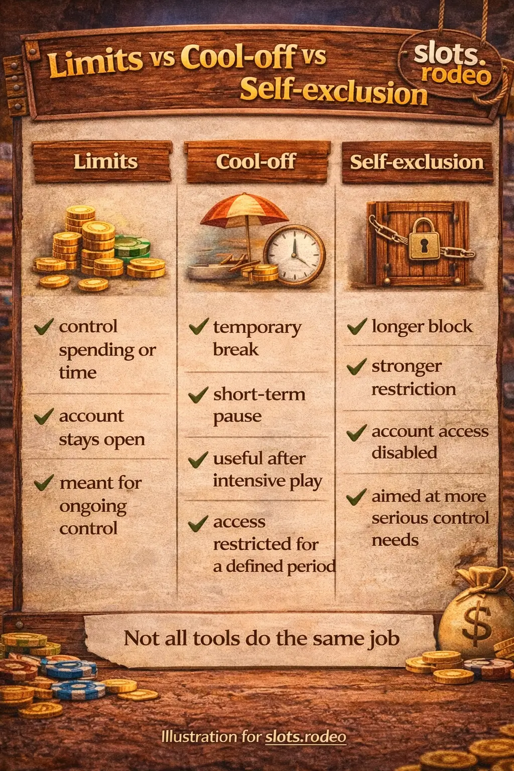 These tools do not do the same job. A deposit limit is not the same as a cool-off period, and a cool-off period is not the same as self-exclusion. Good casinos make those differences clear.