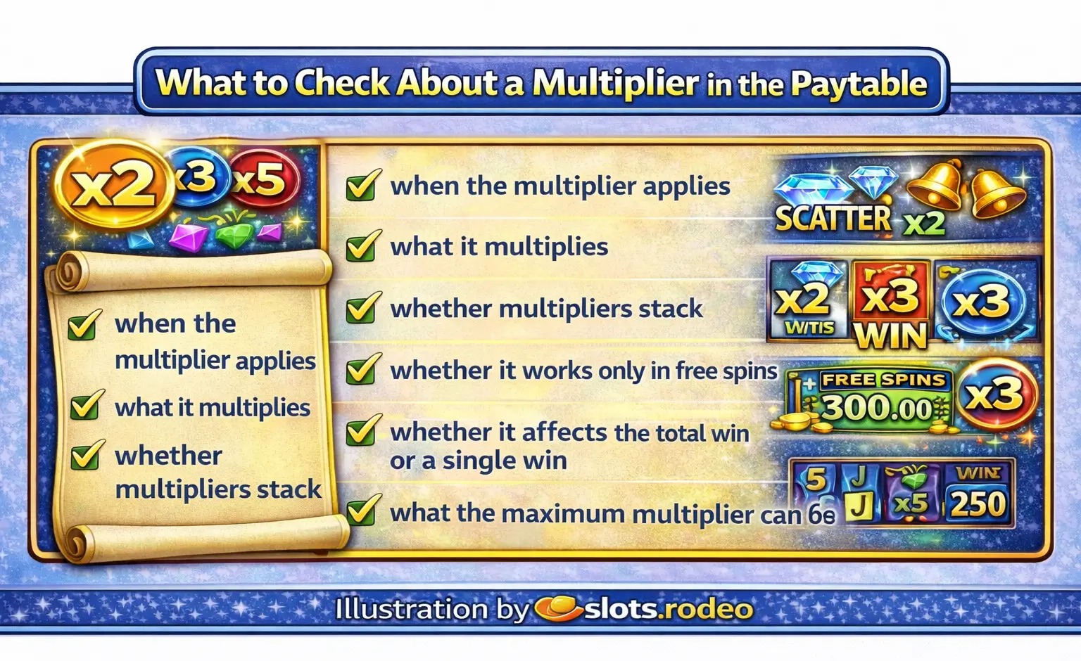 When checking the paytable, do not stop at the text "up to 10x" or "wild multiplier." Read the surrounding rule carefully.