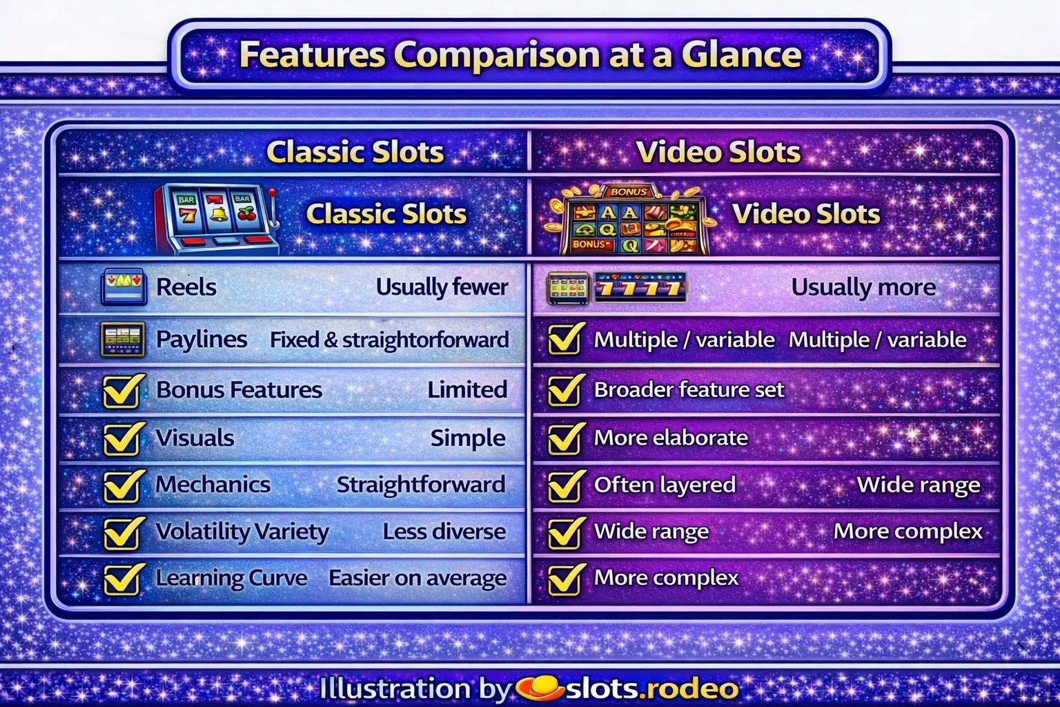| Feature area | Classic Slots | Video Slots |