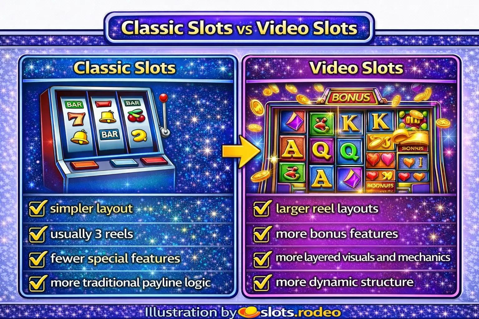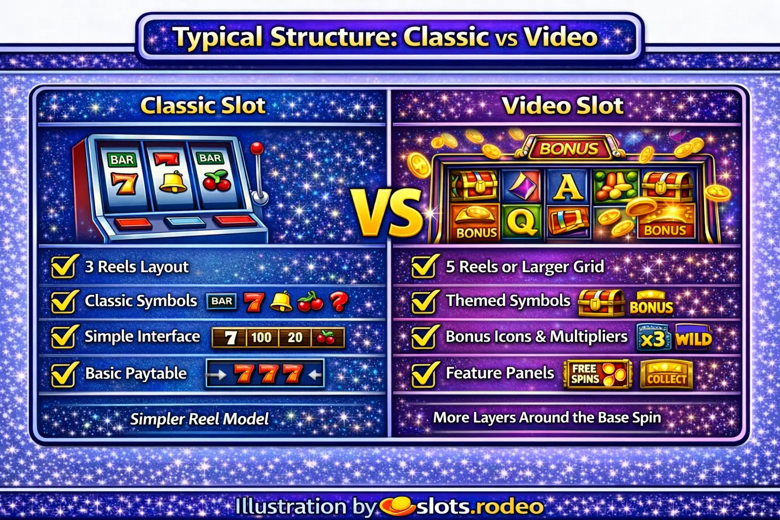 Classic slots usually have a simpler reel structure and fewer features. Video slots usually have more reels, more mechanics, and deeper bonus systems.