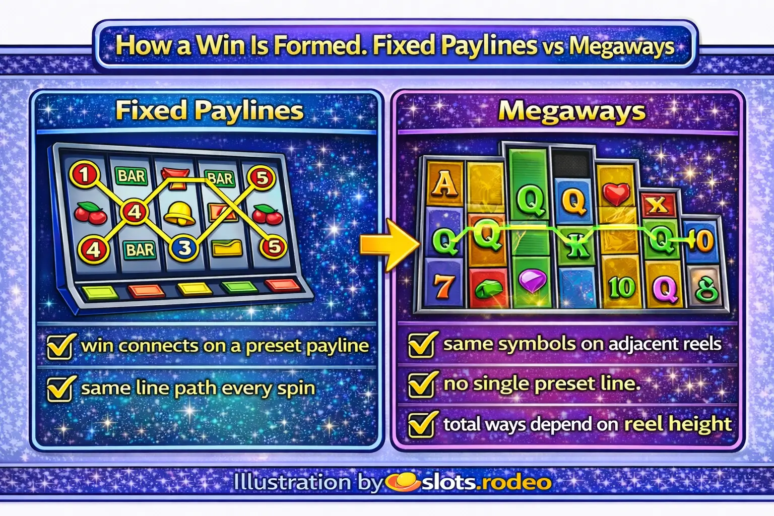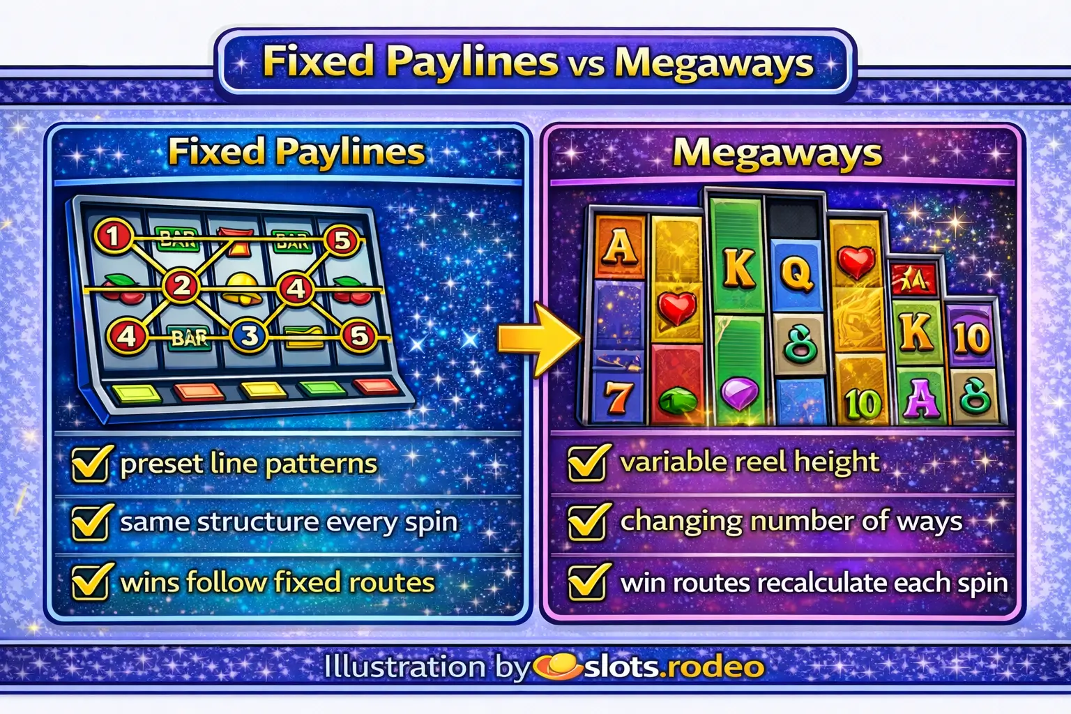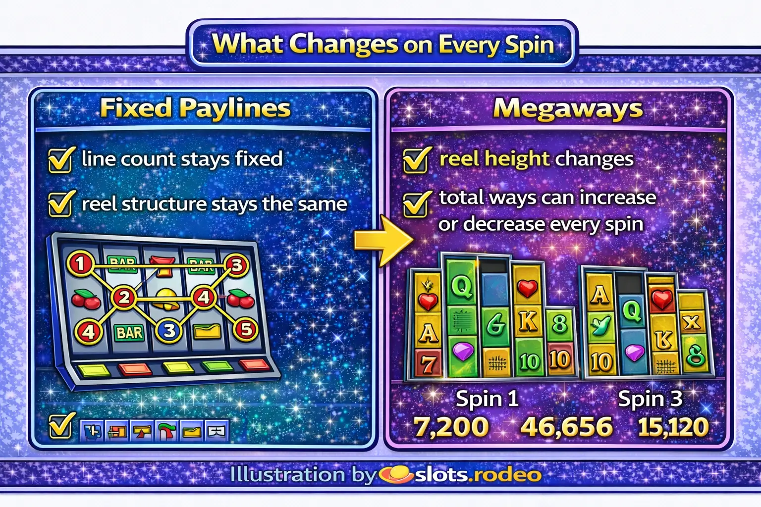 Fixed paylines use the same preset line patterns every spin. Megaways changes reel height and total winning ways from one spin to the next.