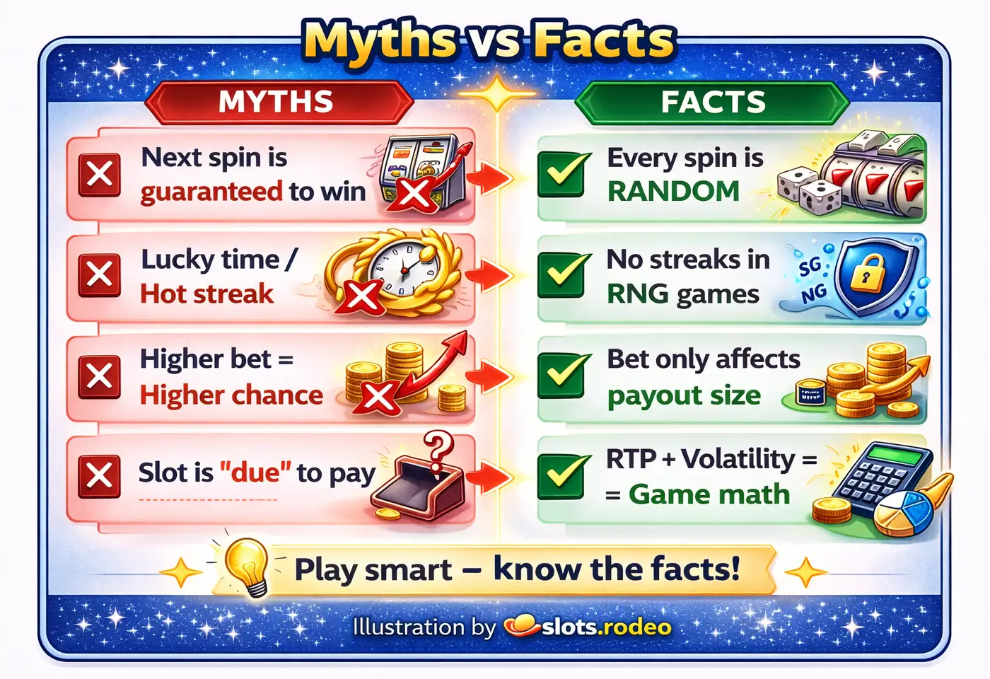 In most slots, bet size primarily changes payout size and the cost per spin. It doesn't give a controllable probability edge. - Myth: "This slot is due to pay."