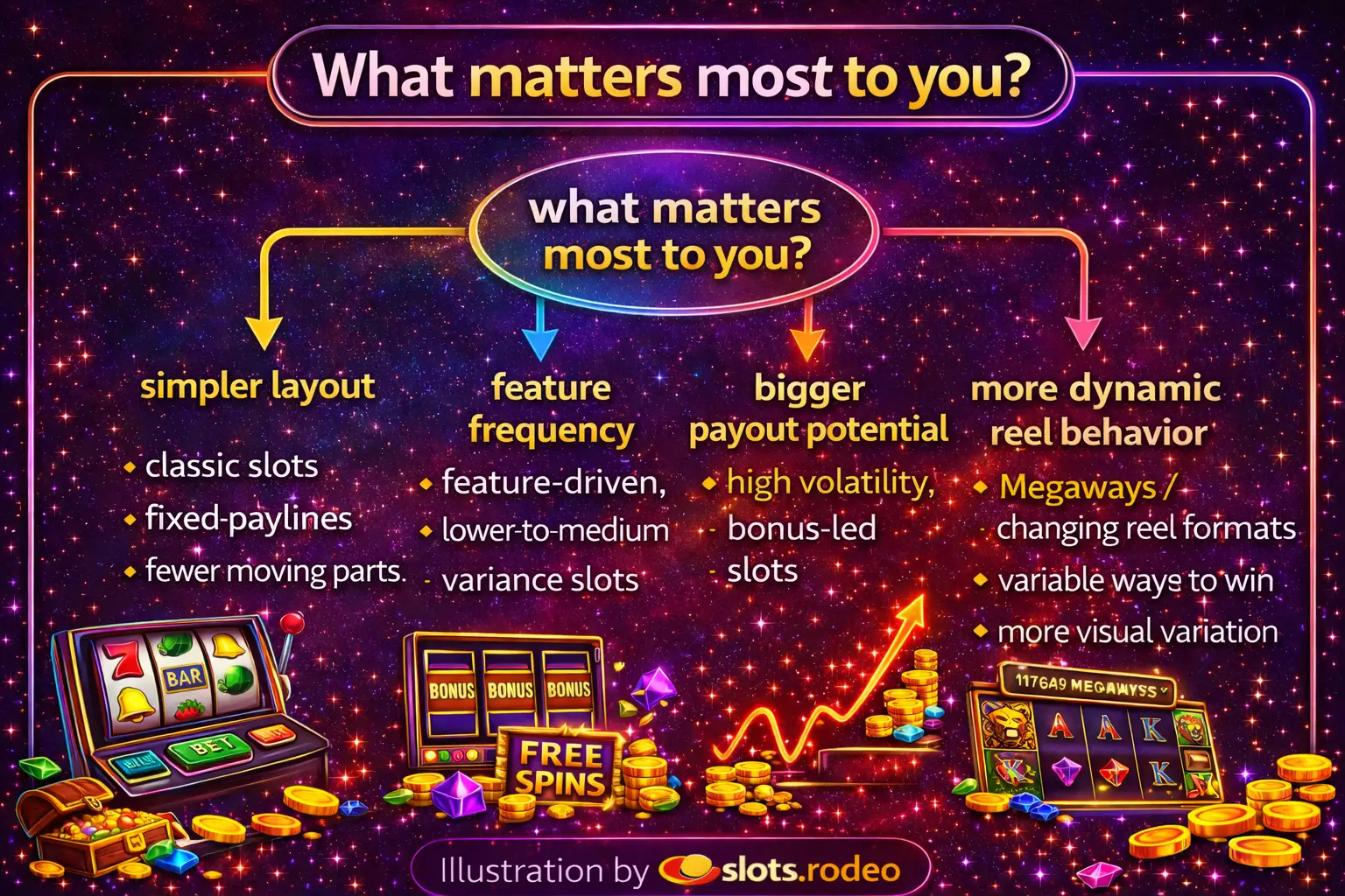 | "I want more changing reel behavior" | Megaways and other variable-layout slots | Reel state can change from spin to spin |